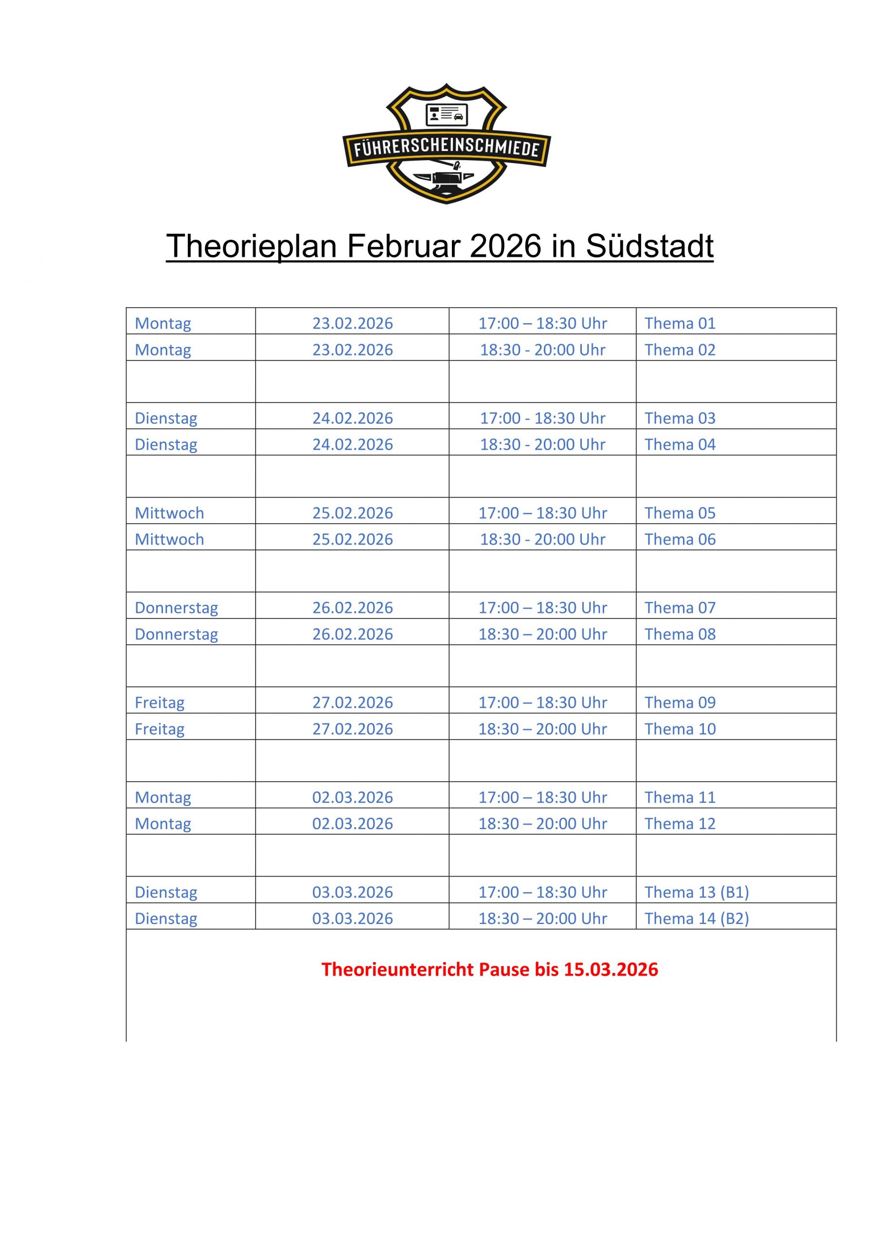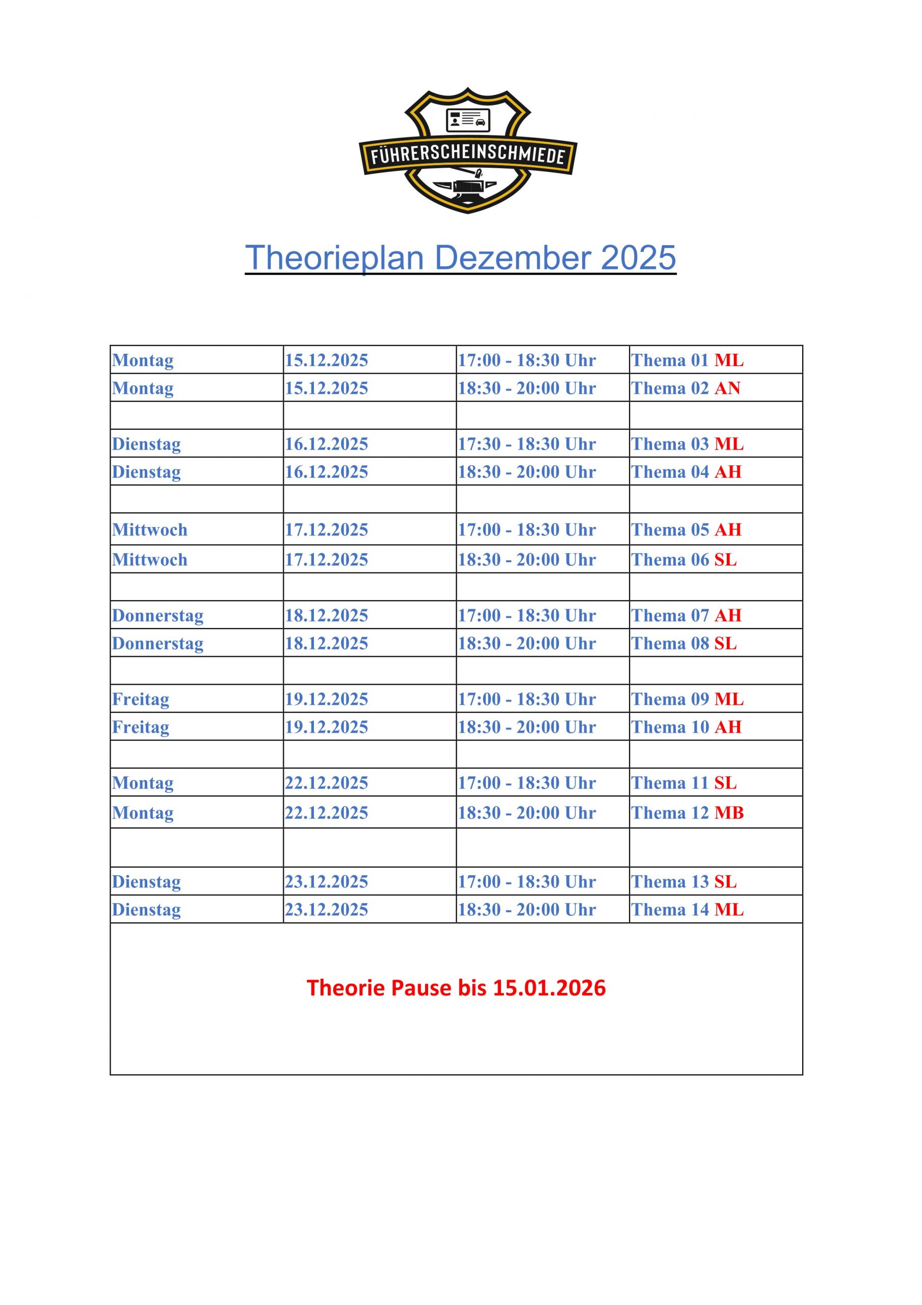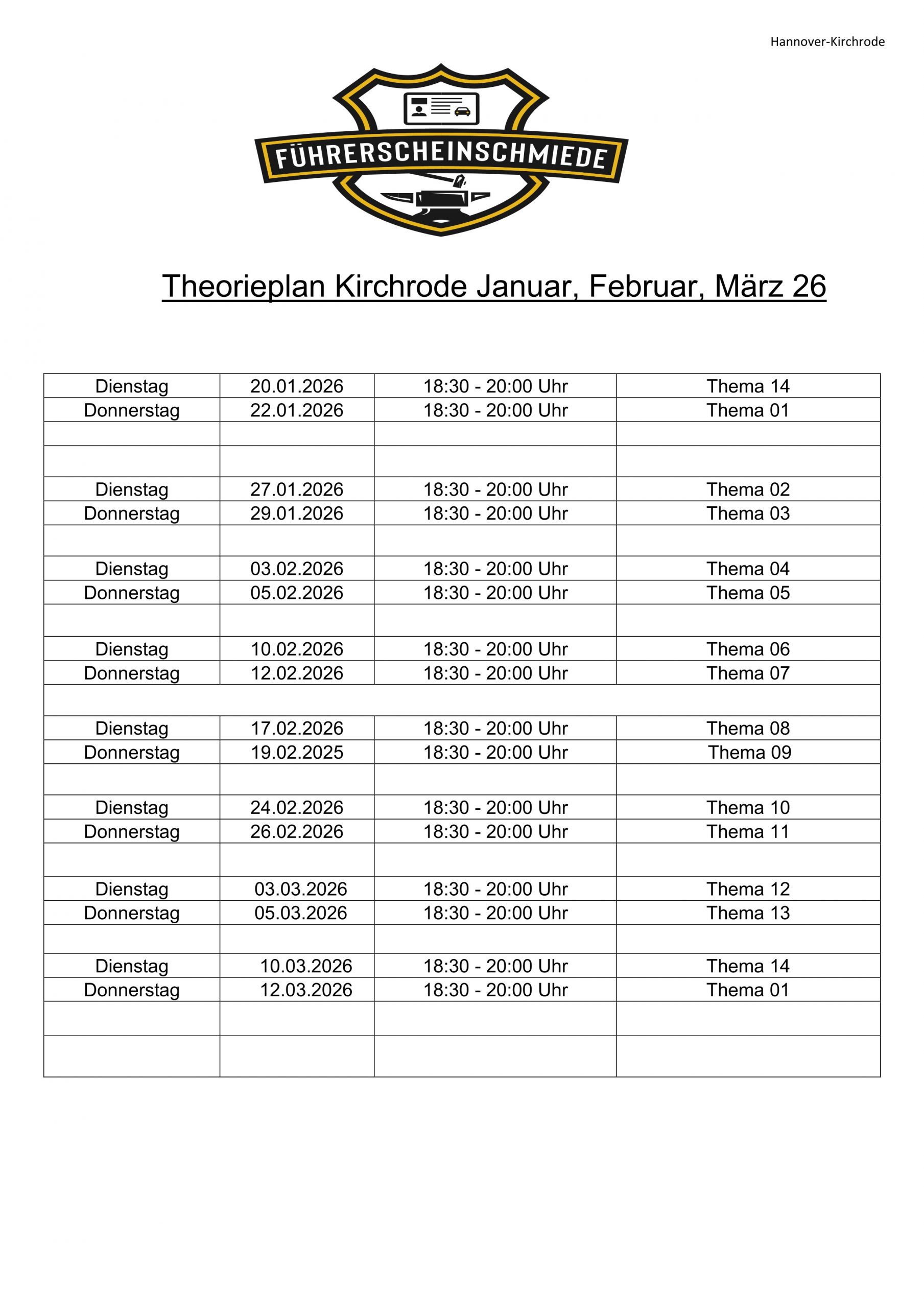 Hier findest du eine Übersicht über unseren aktuellen Theorie-Unterricht.